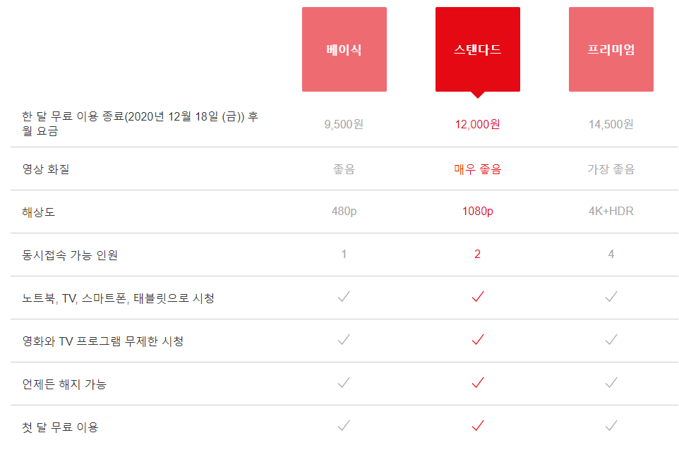넷플릭스 요금제는 크게 베이식, 스탠다드, 프리미엄으로 구성되어있습니다. 베이식 요금제는 9,500원, 스탠다드 가격은 12,000원, 프리미엄은 14,500원입니다. 매월 이용료로 기준이 되어있는데요. 여기서 주목할 점은 바로 동시접속 가능 수 입니다. 그래서 가족단위별로 친구끼리 돈을 모아서 요금을 내는 경우도 많습니다. 동시접속수를 꼭확인하면 좋은데, 넷플릭스 베이식 요금제에서는 1명만 가능하며, 스탠다드는 2명, 프리미엄에서는 4명까지 가능합니다.